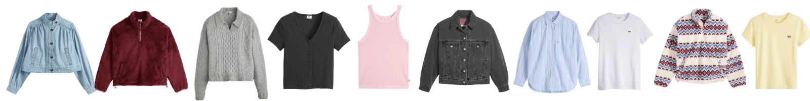 Wśród całej konstelacji propozycji wybierać możesz spośród koszulek i t-shirtów typowych dla marki, takich jak m.in T-shirt z dekoltem w serek (Plus), koszula Harlie Boyfriend, koszulka z dekoltem w serek Perfect, kultowa koszula Western, T-shirt Margot, kamizelka Collegiate Argyle, T-shirt Perfect, koszulka z dekoltem w serek, prążkowany T-shirt turystyczny Levi’s® Dry Goods, Top Dreamy, T-shirt Essential Housemark, Top Boxy, Top sportowy Essential, Dry Goods Vacationer Long Sleeve Tee, Golf Dreamy, T-shirt z długimi rękawami Dry Goods Pointelle, Top Essential Rib, Iconic Western Linen+ Denim Shirt, Graphic Classic Tee, koszula Classic, koszulka polo o wąskim kroju i wiele innych. Warto zwrócić uwagę, że marka oferuje koszulki zarówno o prostym kroju typu boxy czy zwykły v-neck, jak również fasony starannie i unikalnie zaprojektowane na praktycznie każdą okazję, w tym o charakterze sportowym, galowym, wieczorowym, randkowym, a nawet vintage 'a la lata 90-te. Nie można tu nie wymienić takich typów i krojów jak np. koszula Darlene z krótkim rękawem, Top Effortless z grafiką, Perfect Slub V-Neck Tee, T-shirt o pudełkowym kroju z grafiką, dżinsowy top gorsetowy Bella, Top Boxy z nadrukiem, T-shirt sportowy Essential z grafiką, długa kamizelka dżinsowa, T-shirt futbolowy z długimi rękawami, dżinsowy top gorsetowy, Levi’s® Pride T-shirt Cinched Short Stack.